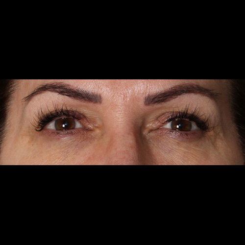 49 y.o. female with heavy and low eyebrow position, and excess skin of the upper eyelids resting on the eyelashes. The lower eyelids show visible “bags” and wrinkled skin causing a more “tired” look. The surgery performed was an upper and lower eyelid lift (“blepharoplasty”) and brow lift. The brow lift