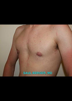 19 year old male with gynecomastia and breast enlargement, especially under the nipple areas. After minimal-incision surgery, the excess tissue is gone, and the outline of the patient’s chest wall and pectoralis muscles show excellent contour.